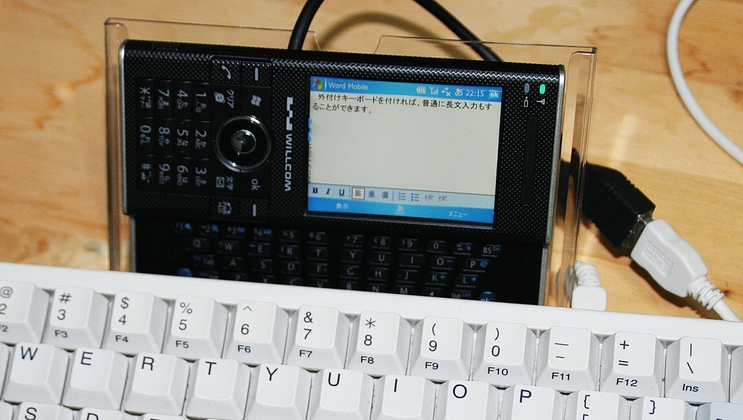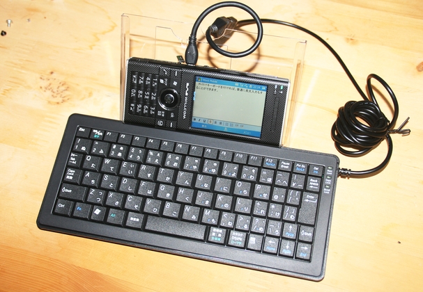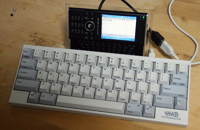 W-ZERO3es にUSBホスト・ケーブル経由でキーボードを繋げてみる。同系色のミニ・キーボードも良い感じだけれど、白いハッピー・ハッキング・キーボードと繋げてみるのもなかなか目が良い感じ。